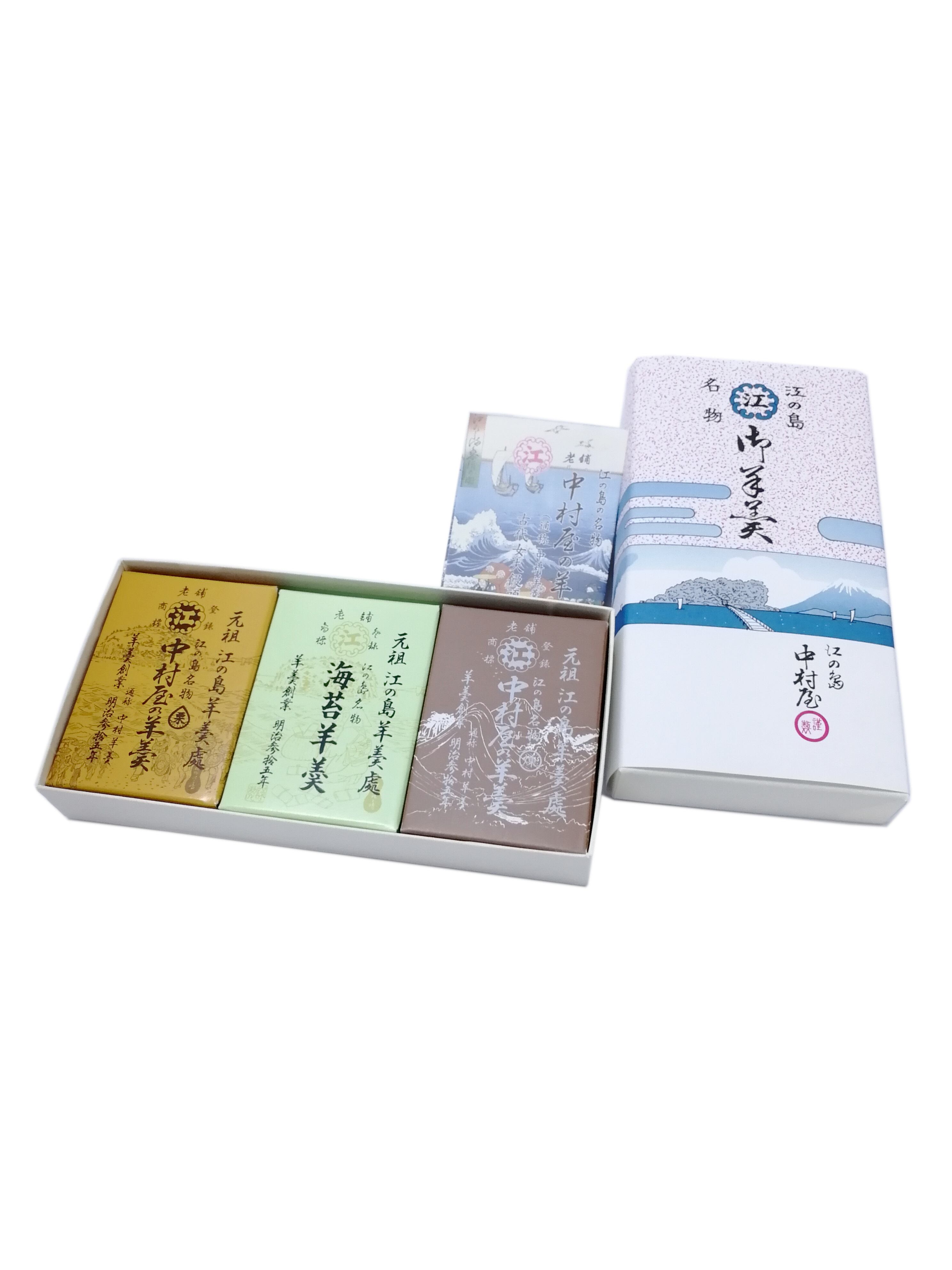 名物の海苔羊羹、栗羊羹、煉羊羹を箱詰に致しました。弁天塩羊羹、海苔羊羹、栗羊羹、煉羊羹の中から3種類お選び下さい。ご指定がない場合は写真と同様の海苔羊羹、栗羊羹、煉羊羹の詰め合わせでお送りさせて頂きます。